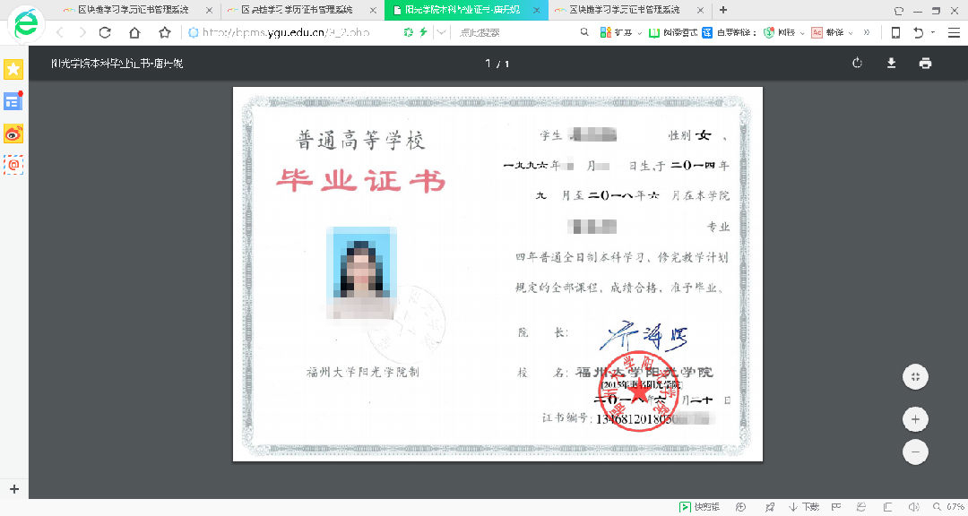 目前,陽(yáng)光學(xué)院已在官網(wǎng)上設(shè)置了數(shù)字證書(shū)系統(tǒng)的入口,并能演示數(shù)字證書(shū)系統(tǒng)的部分核心功能。畢業(yè)生在官網(wǎng)中找到系統(tǒng)入口,登陸自己的安全賬號(hào)后,便可找到自己的“證書(shū)資產(chǎn)”,再點(diǎn)擊打印,一張內(nèi)含可認(rèn)證信息的PDF格式數(shù)字畢業(yè)證書(shū)便輕松生成。