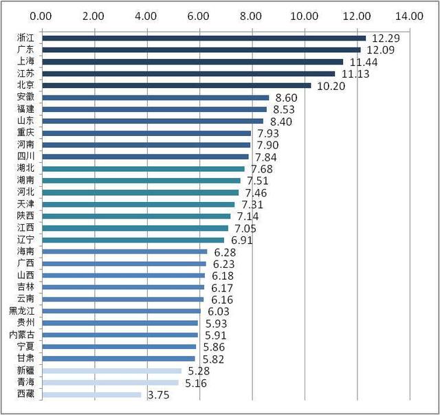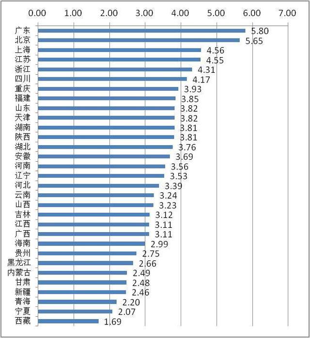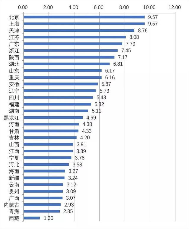 態(tài)勢二:2017年,我國區(qū)域創(chuàng)新能力水平差異懸殊,呈現(xiàn)出東部高、中部和西部低的特征。全國31個省市的創(chuàng)新引領(lǐng)能力平均指數(shù)5.18, 最高值為9.57,最低值為1.3。