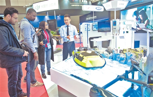 11月18日,首屆聯(lián)合國(guó)世界地理信息大會(huì)技術(shù)與應(yīng)用展覽在浙江省德清縣開(kāi)幕。圖為展商向參觀者介紹一款智能無(wú)人測(cè)量船。
